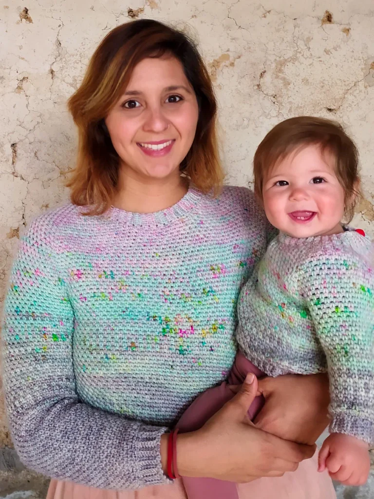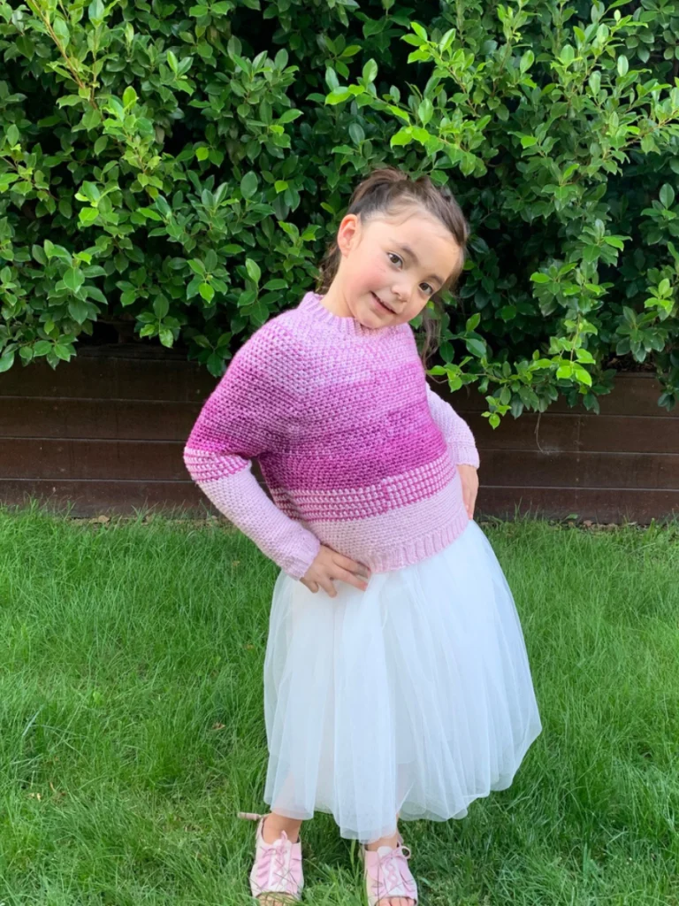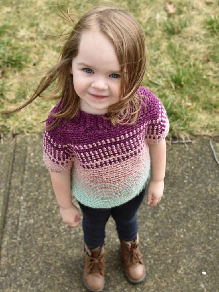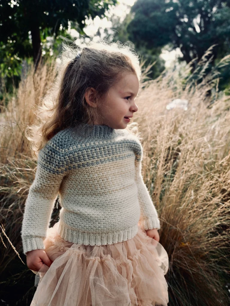 YARN: Children:(3m) 280 m, (6m) 300 m, (12m) 340 m,(18m) 370 m, (24m) 400 m, (2) 430 m, (4) 460 m, (6) 520 m, (8) 600 m, (10) 680 m DK yarn (size 3) divided into 4 different colors as follows: CA (top) – 20%, CB – 20%, CC – 25%, CD – 35%.