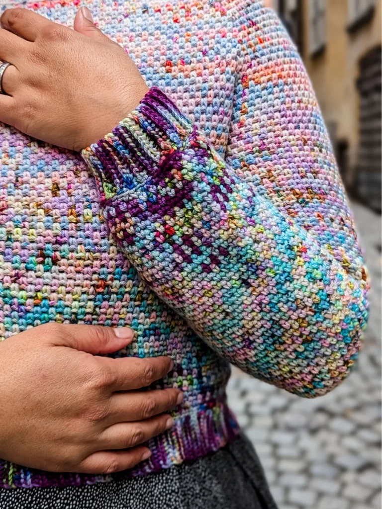 It is a compound raglan yoke sweater worked seamlessly, mostly in rounds. The stitch used throughout makes the fabric warm, yet very light – you can even use cotton yarn for a Spring sweater. The pattern comes with a suggested color transition of 5 different colors, but you can use as many colors as you want. Perfect for using up your yarn stash!