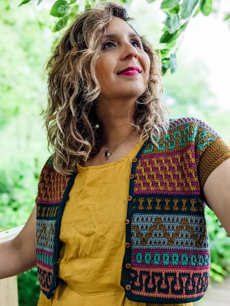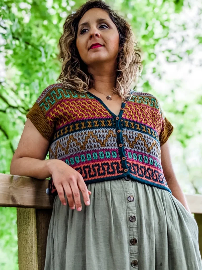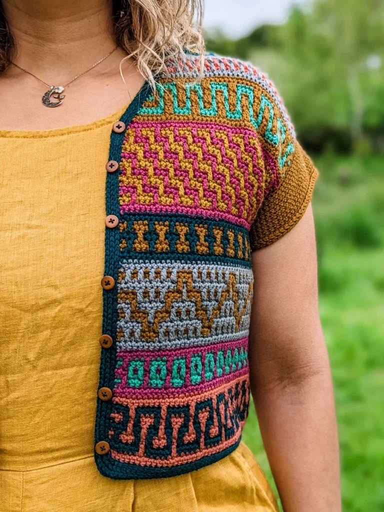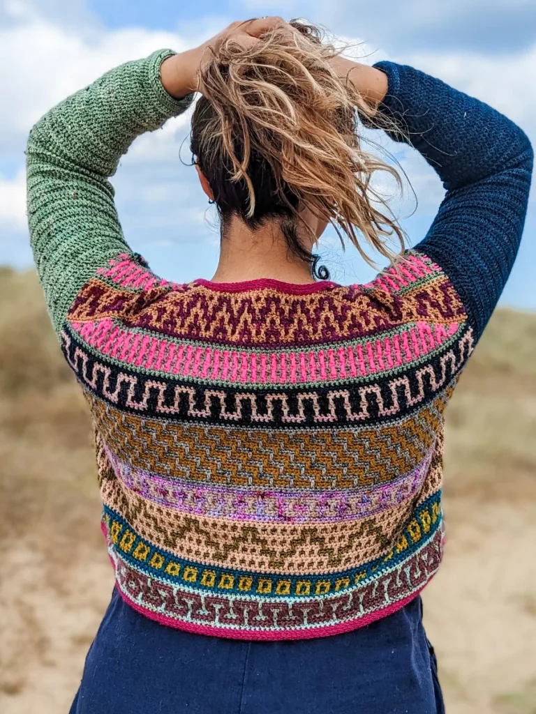 The Mosaic Cardigan is a celebration of nature at its best – inspired by flower meadows that lie dormant in winter only to burst out in color with the arrival of Spring. With ALL of the colors and fun mosaic graphics, it’s the perfect garment to use up yarn in your stash, to experiment and have lots of fun with color. It is worked top-down completely seamlessly with a slight drop-shoulder and tapered sleeves. The body follows Standard Mosaic Crochet charts, and the pattern comes with complete video tutorials for learning all of the necessary techniques. The Mosaic Cardi is the sister pattern to the Mosaic Jumper with a few differences; the Cardigan calls for Fingering weight yarn and it uses Standard Mosaic Crochet worked flat, while the pullover calls for Sport weight yarn and is made using Single-Row Mosaic Crochet in the round. Use the coloring page at the end to plan your color scheme!