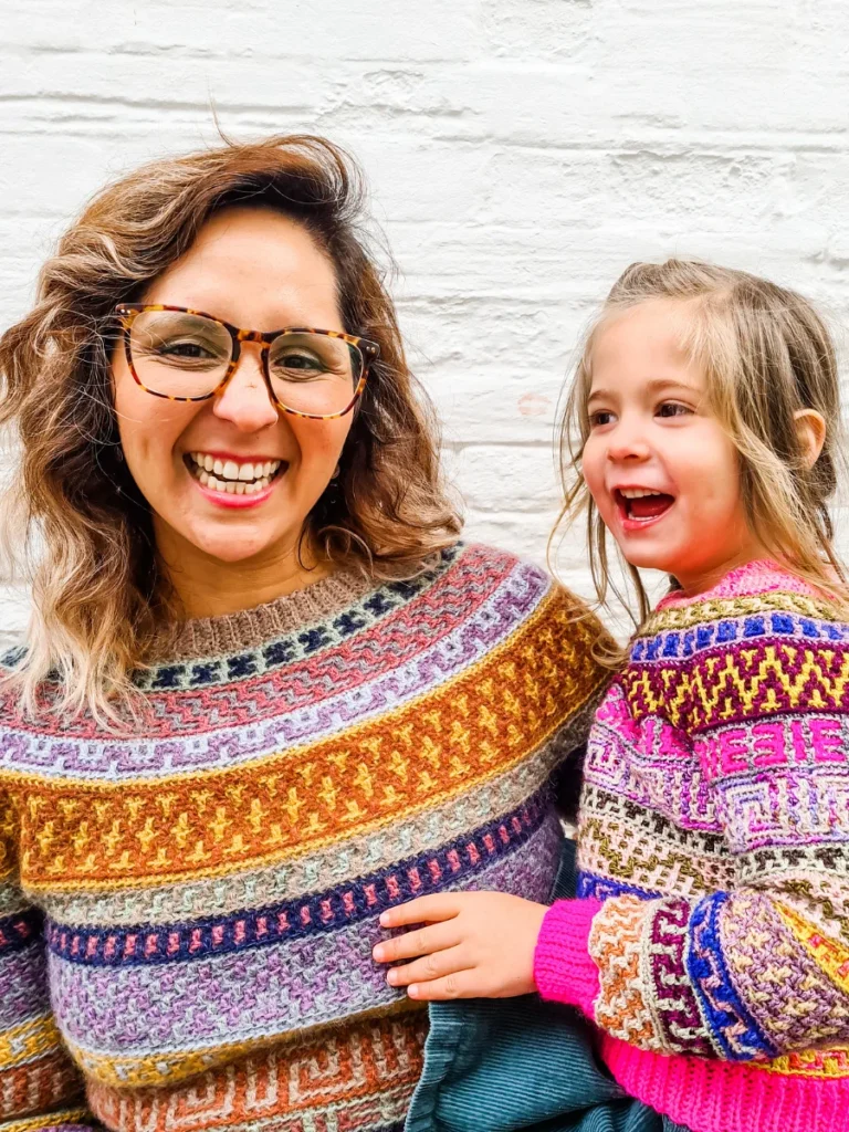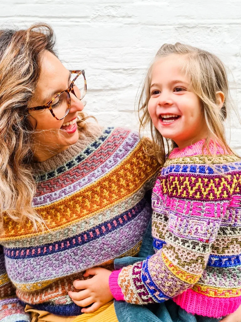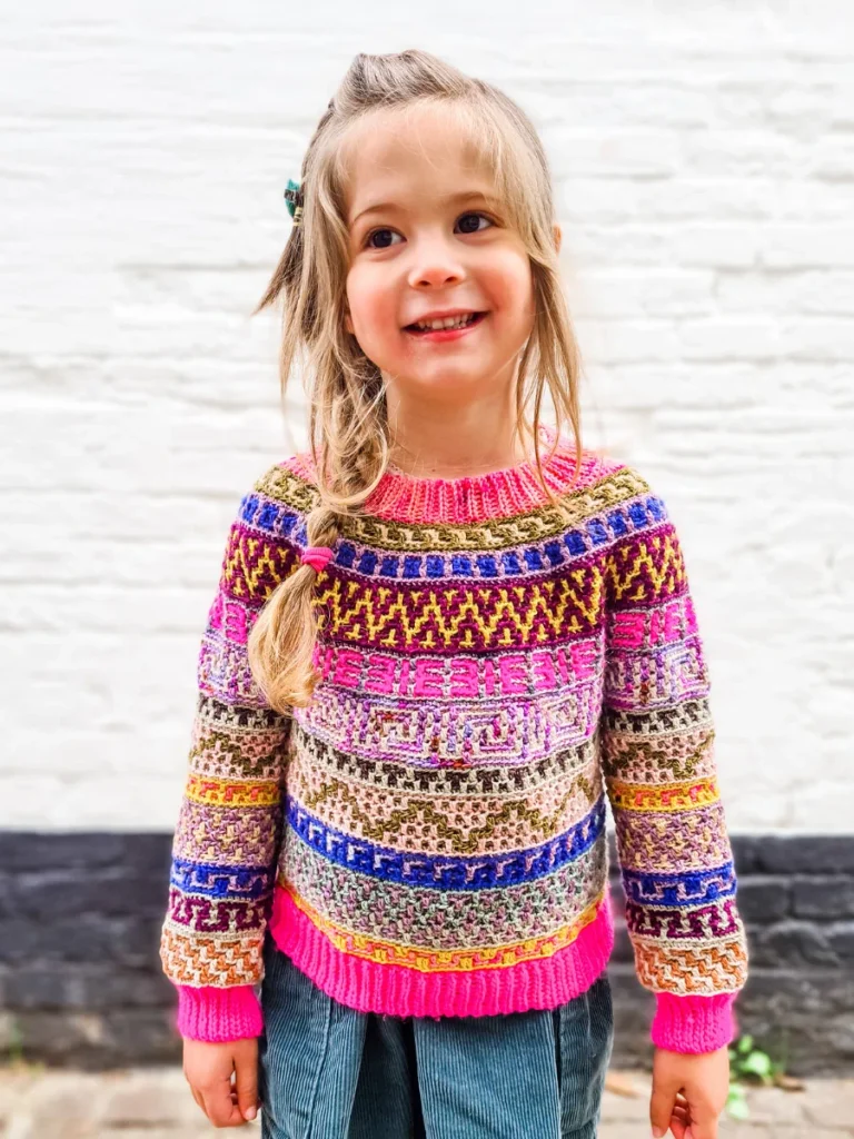 The Mosaic Jumper is a celebration of nature at its best! It’s inspired by flower meadows that lie dormant in winter only to burst out in colour with the arrival of Spring. With ALL of the colours and fun mosaic graphics, it’s the perfect garment to use up yarn in your stash, to experiment and have lots of fun with colour. It’s a round yoke pullover with short rows at the back for a perfectly comfortable fit. It has loose sleeves that puff slightly at the bottom, and it is sure to brighten any little one’s wardrobe! The pattern follows mosaic chart and comes with complete video tutorials for learning all of the necessary techniques.
