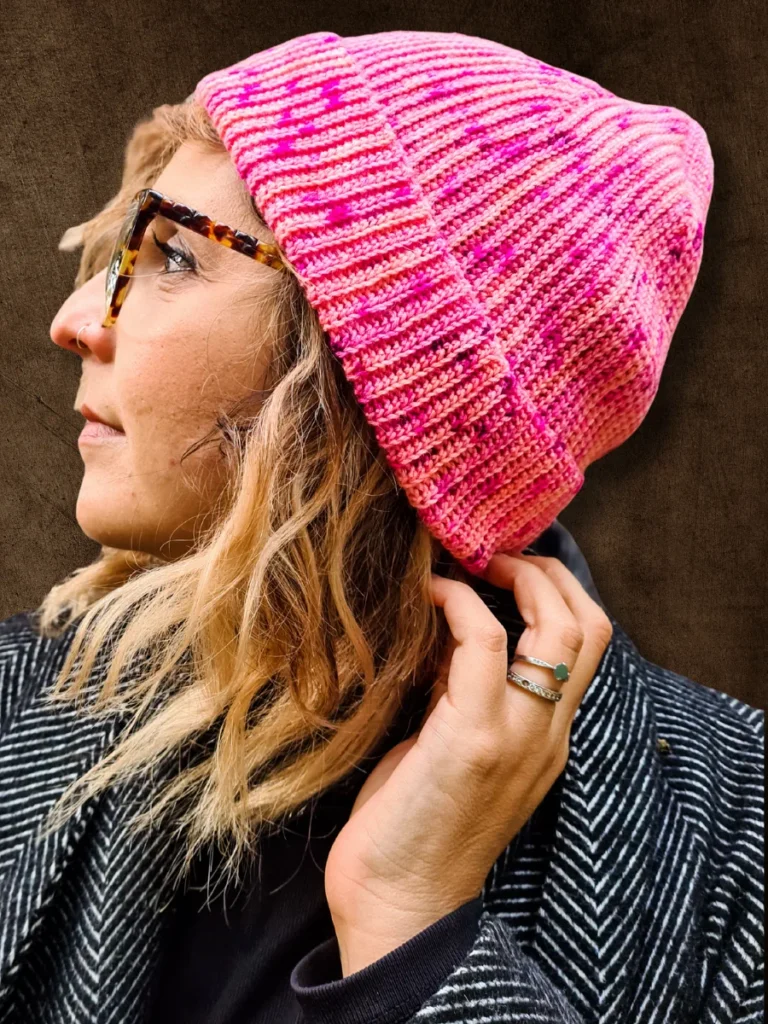 A wool or wool blend yarn is recommended for better memory and elasticity in the ribbing.