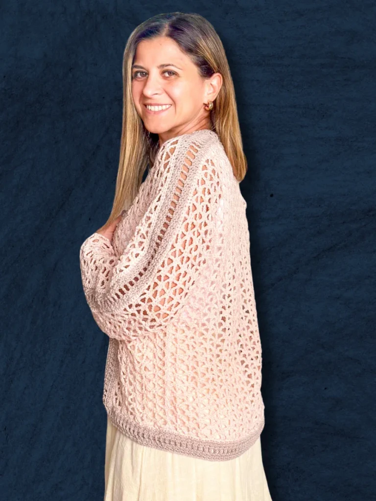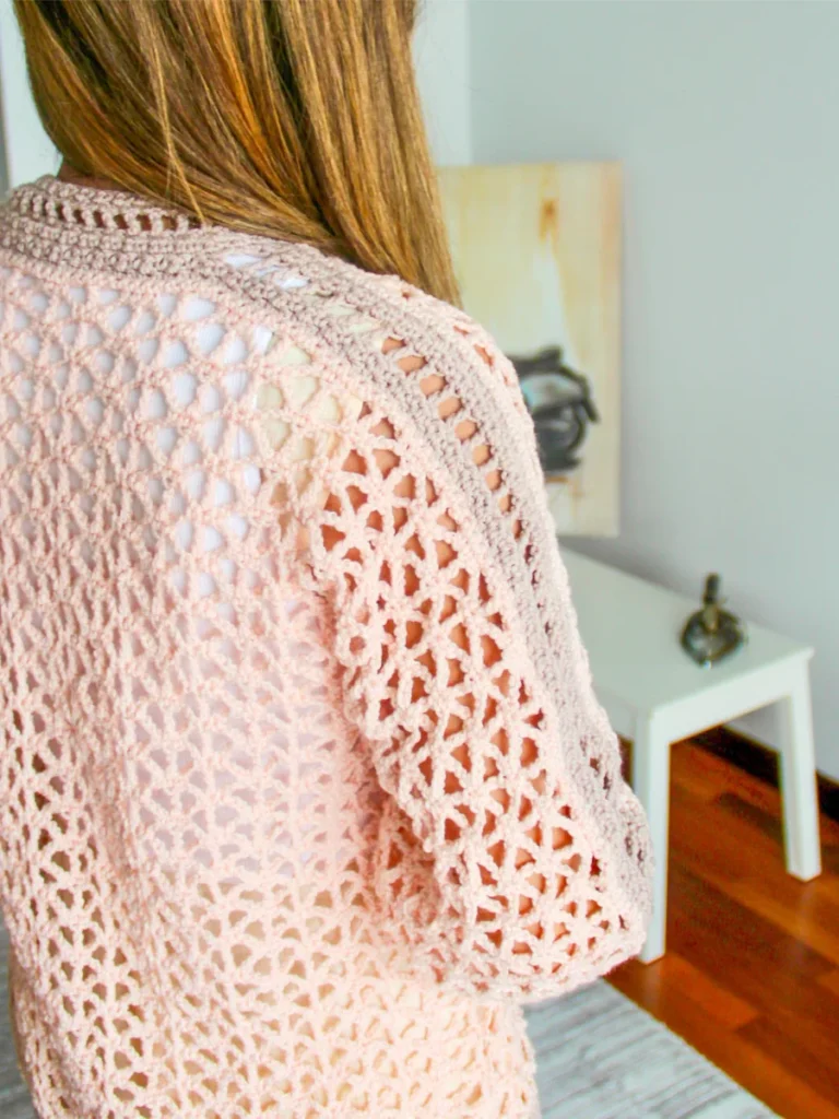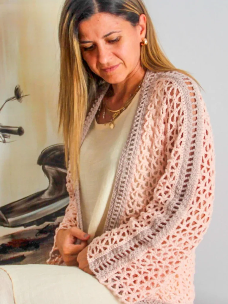 It is worked in one flat panel and joined from the sides to the sleeves. The cardigan has 2-3 cm of positive ease, so if you prefer an oversize fit, you may work one size up.