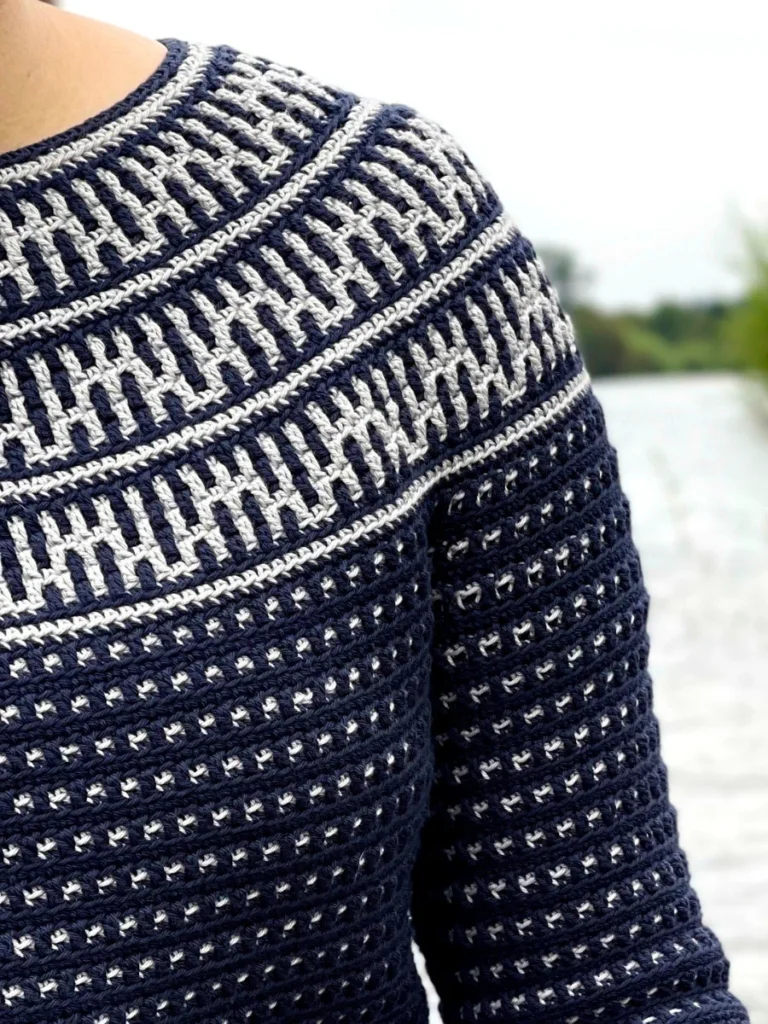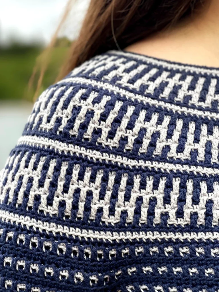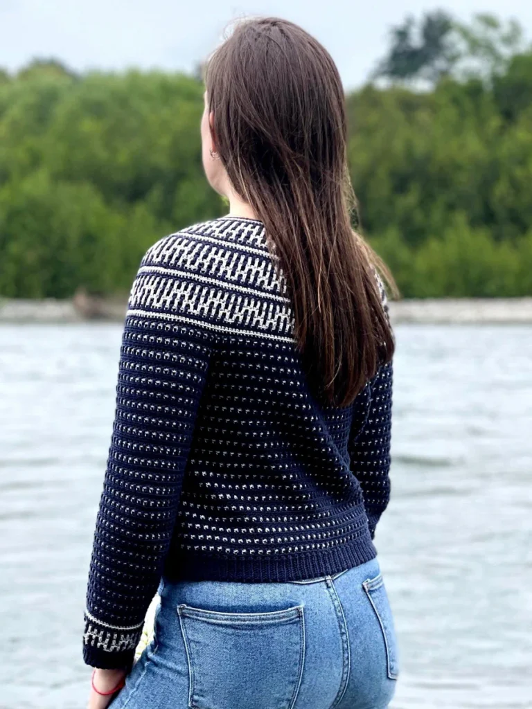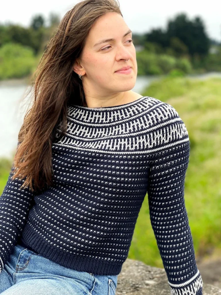The Riverside Pullover – where style meets versatility in a seamless blend of comfort and creativity! This top-down wonder embraces the art of color with its captivating round yoke adorned in a mesmerizing mosaic motif. All colorwork is made using the Overlay Mosaic Crochet Technique (also sometimes called Single Row Mosaic Crochet). The rhythmic stitch pattern and effortless construction make each crochet session a soothing journey, ensuring you’ll find yourself returning to this project time and again.