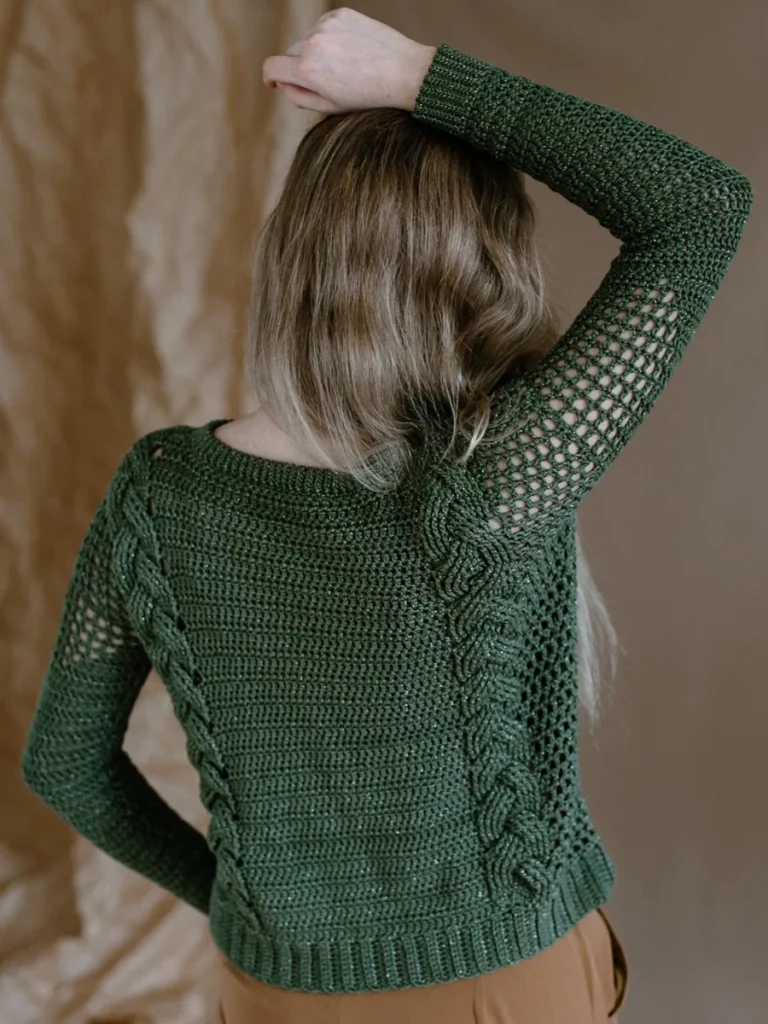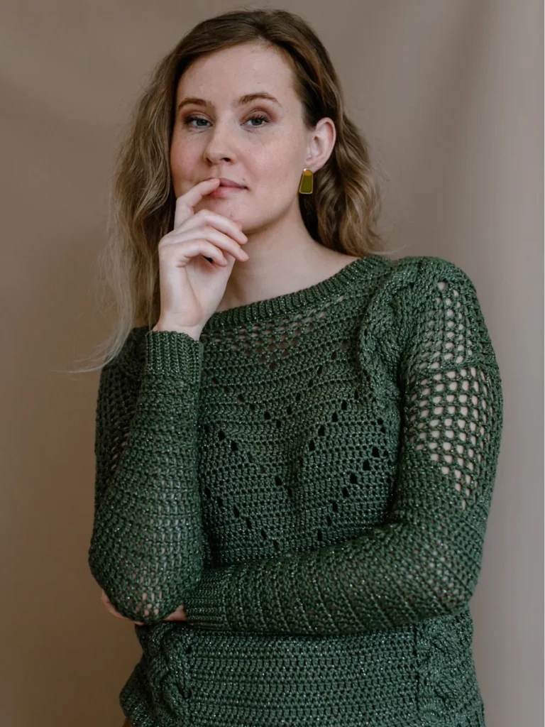 This design takes the classic concept of crochet cables and gives them a modern twist in the context of the Rudens sweater. While the design boasts an appearance of simplicity, a closer look reveals the intricate mesh segments on the sides and filet crochet “arrows” in the front, adding an extra layer of intrigue to the garment.