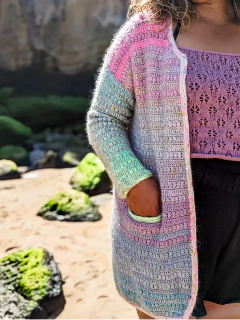 Sabatini boasts a top-down construction with a crew neckline and drop-shoulder elegance, ensuring perfectly fitted shoulders that eliminate excess fabric around the underarms. Featuring a delightful combination of textured and airy stitches, this cardigan is tailored for light garments and offers a generously wide, oversized fit. Elevate your creation with optional pockets, hip shaping, and rounded corners at the front, all tastefully finished with an elegant edging and buttons band. The Sabatini Cardigan beckons you to unleash your creativity with numerous customization options, allowing you to craft a truly one-of-a-kind garment.