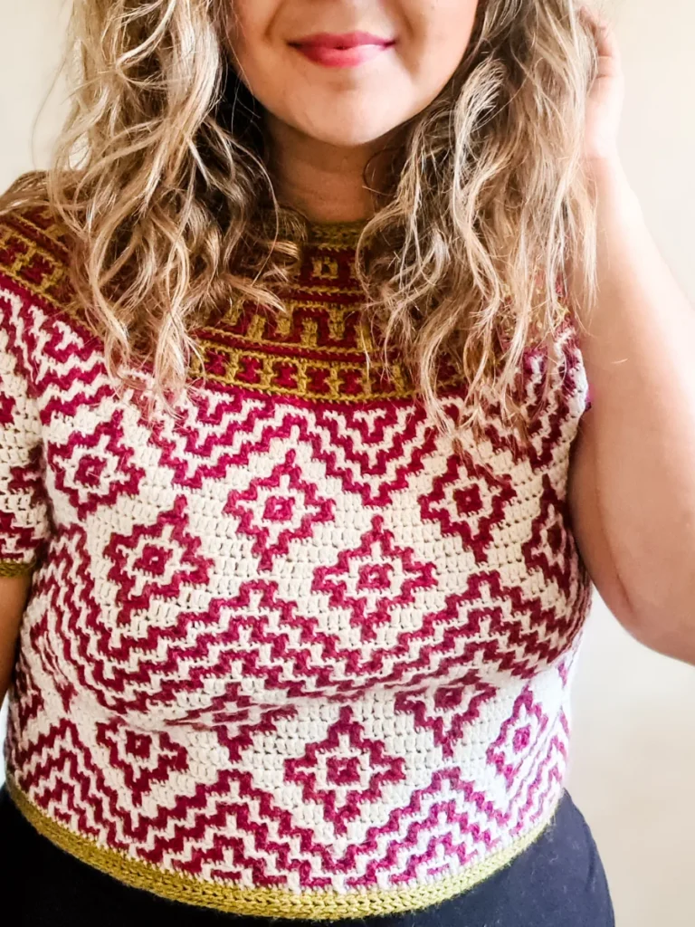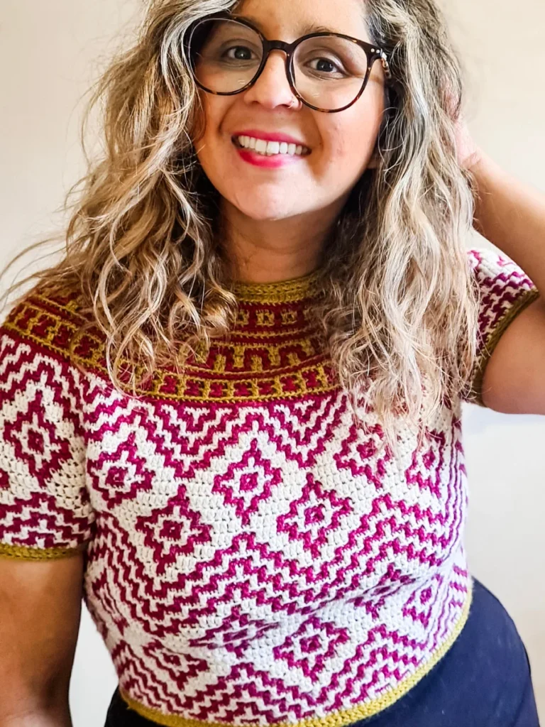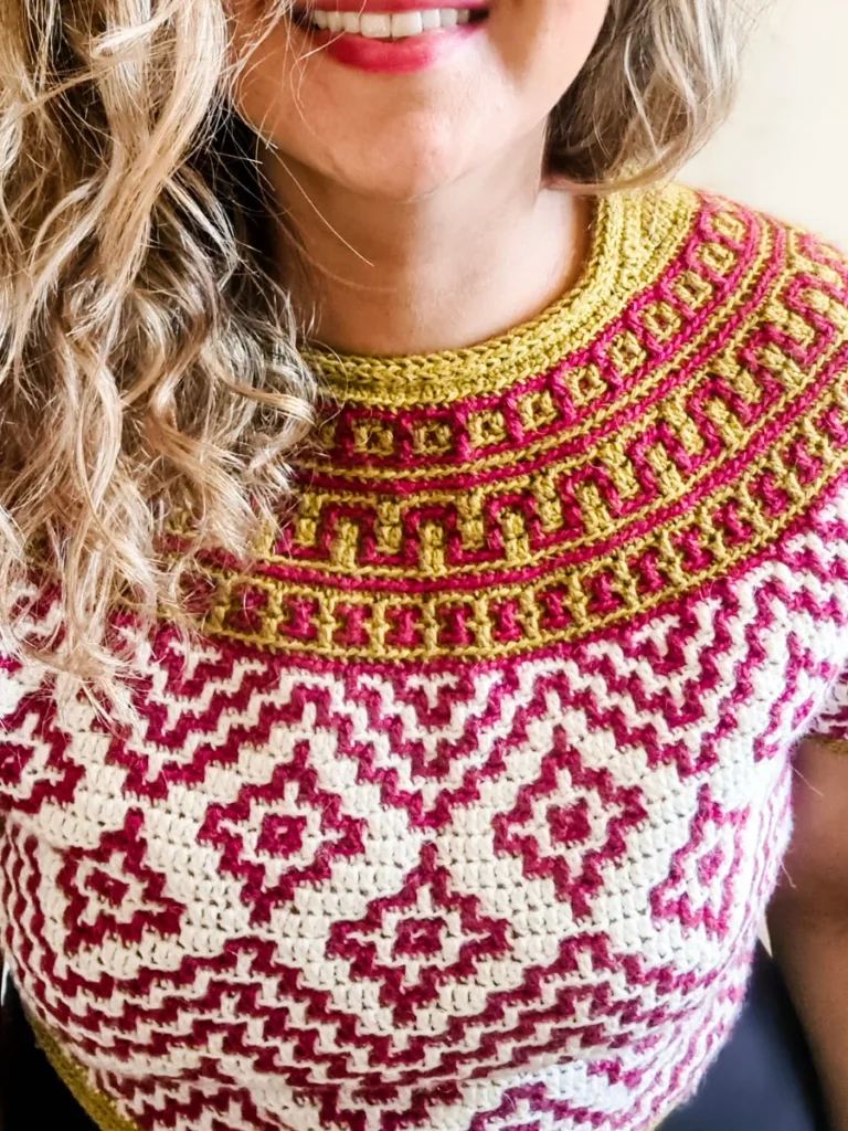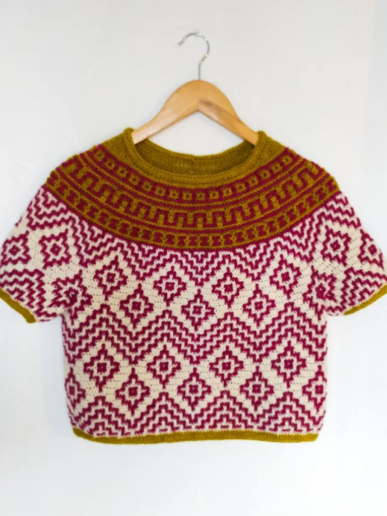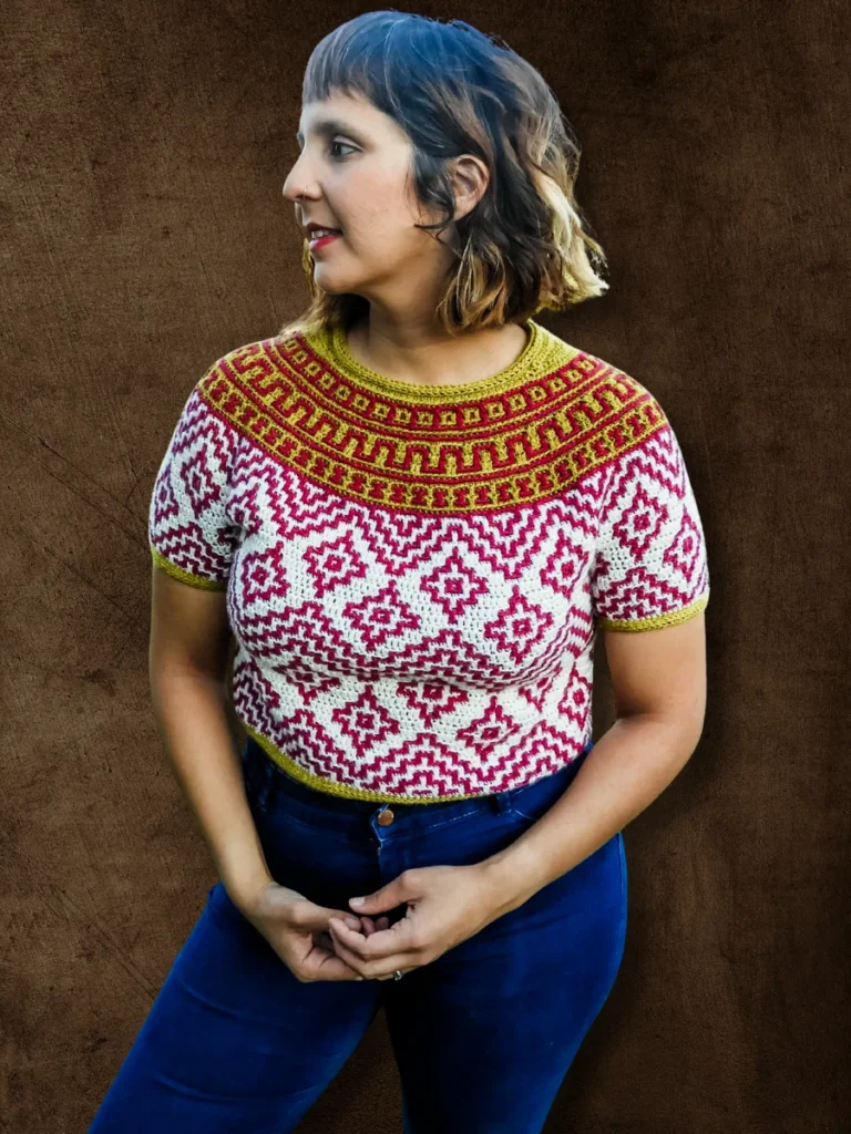 Teotihuacan is an ancient city located in the heart of Mexico. It reminds of the magnificence, beauty and thought that went into these kinds of constructions even at such early times in our history. The top evokes the imagery and shapes found in these pyramids and ancient settlements and will bring so much energy and joy into any wardrobe. It is constructed top-down with short rows at the back of the neck for that perfect fit on the shoulders. The circular yoke and body are worked in rounds. The length of sleeves and body is easily adjustable. The pattern now comes with a coloring page to help you plan your colors!