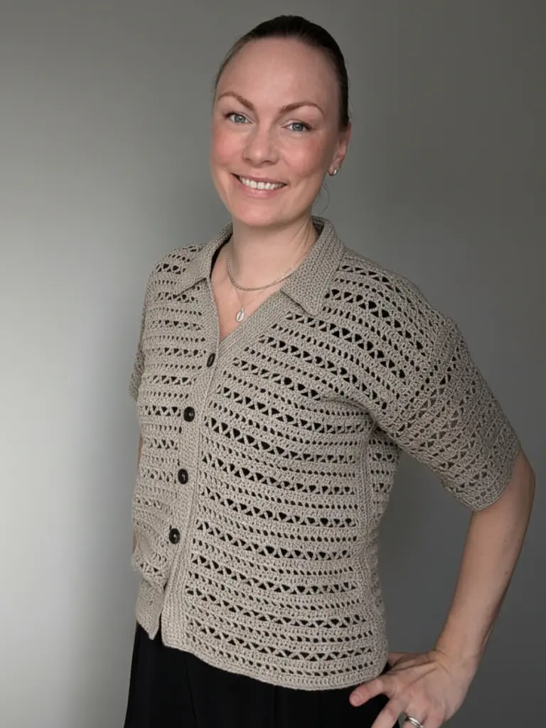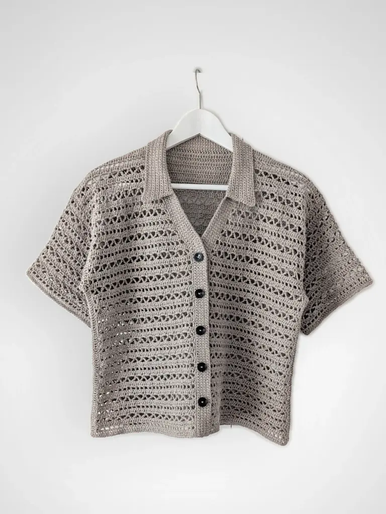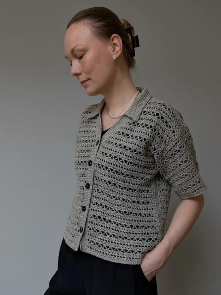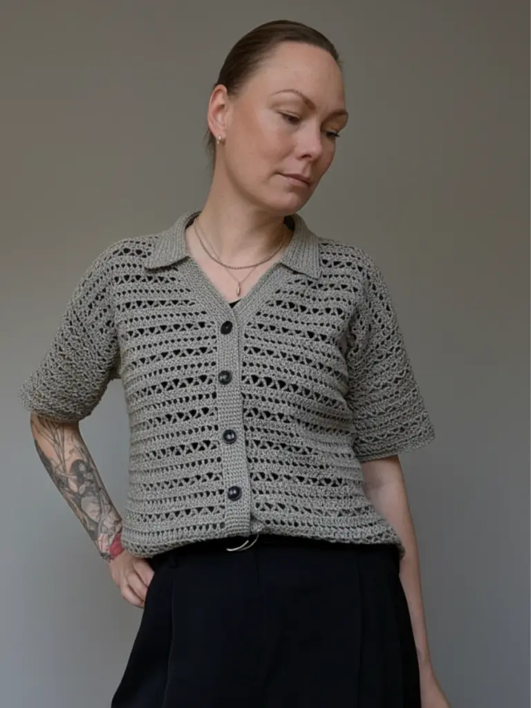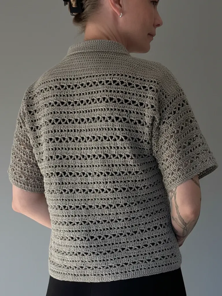 Worked in fingering weight yarn, the shirt is constructed in flat panels using basic stitches in an easy-to-memorise pattern repeat. Thoughtful shaping across the shoulders, body, and sleeves ensures a clean and comfortable fit. The front, back, and sleeves are worked separately and seamed together. The sleeves, button bands, and collar are worked directly onto the body, giving the piece its neat finish.