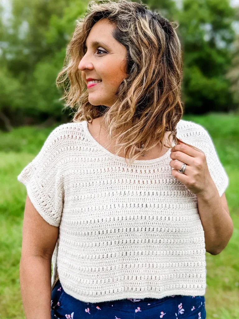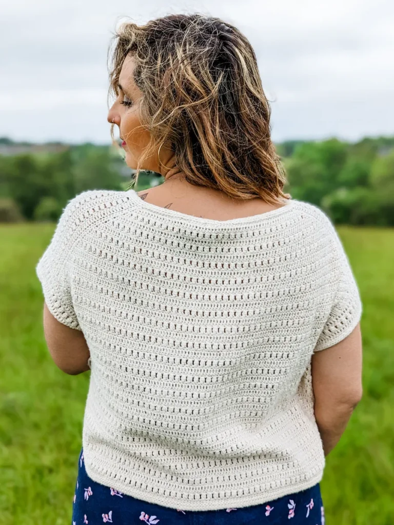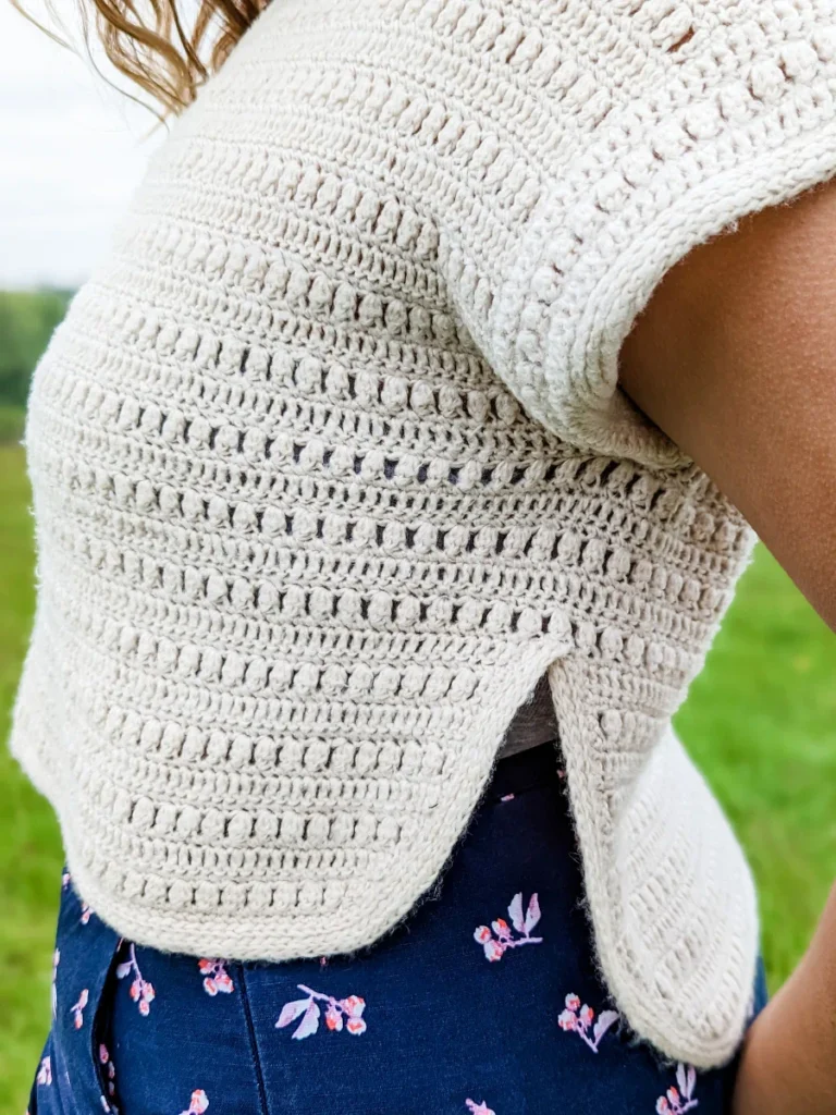 Sample used Pascuali, Suave (100% Organic Cotton, 25g, 162 m / 177 yds) in color Cream (50). Approx 6 (6, 7, 8, 8) (9, 9, 10, 11) balls used for a cropped high-low hem as in pictures.