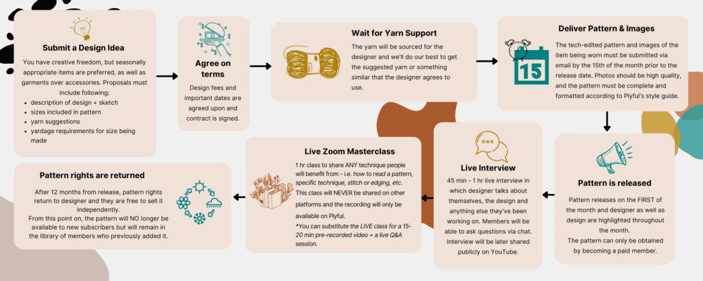 - Idea for a masterclass: This can be a technique or a topic that you would like to discuss, either related to your pattern or not. The proposal doesn’t have to be too in-depth, but just a blurb about what you can potentially teach during your month. If teaching a live class scares you or is simply not your jam, it’s ok! Please, still apply and we will figure something out!