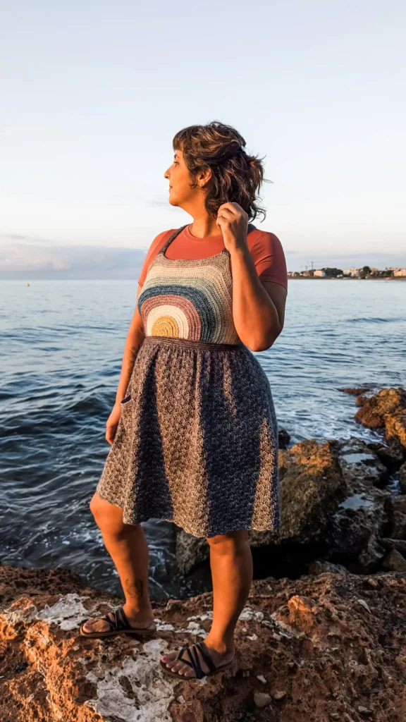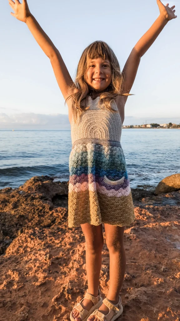 Rainbows are little bridges of magic in the sky, carrying whispers of hope and bright adventures ahead — and the Hope Dress captures that spirit in every stitch. Crocheted in soft, breathable sport-weight cotton, it’s light enough for twirling through sunny days and cozy enough for year-round wonder. An elasticated waist makes for comfy fit-and-forget wear, while handy pockets are perfect for stashing pebbles, petals, or secret treasures. Whether for a birthday tea party or an afternoon chasing butterflies, this dress is ready for every adventure — big or small.