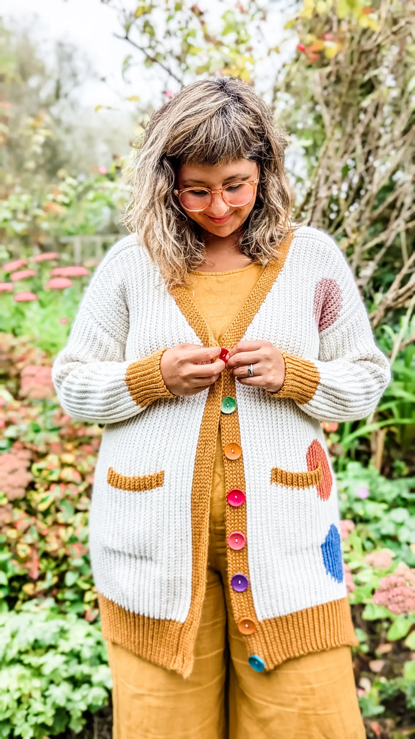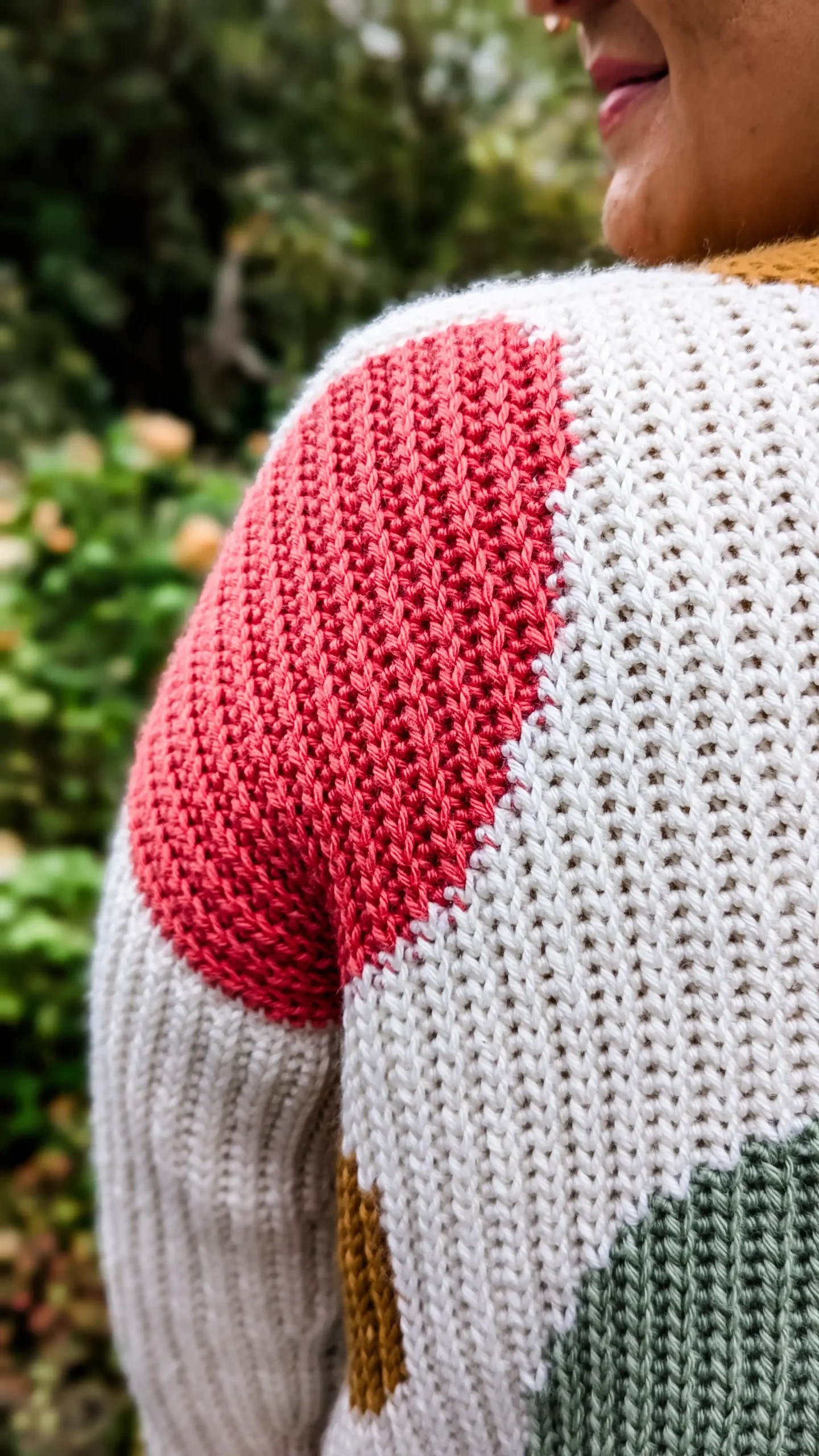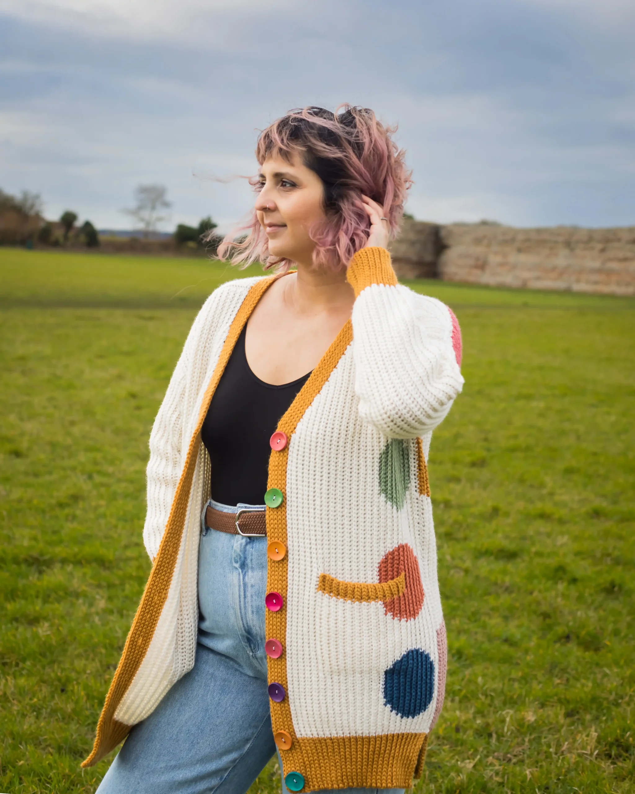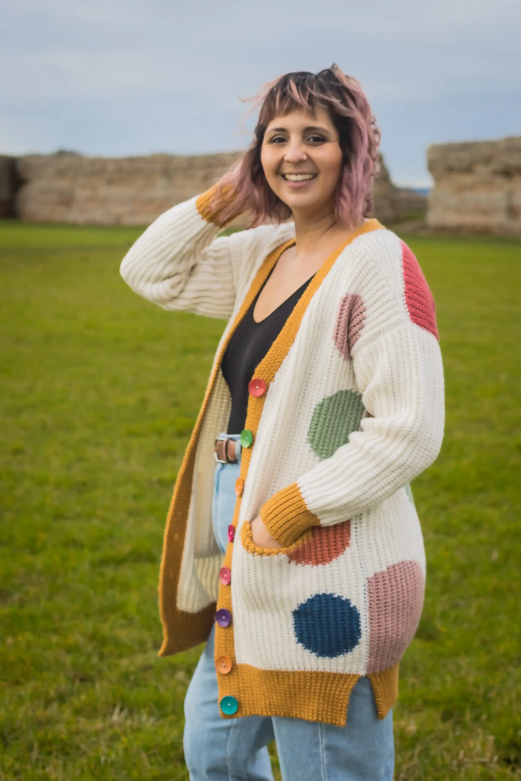 You know that feeling when you see a bunch of puppies playing with ducklings, or a baby’s first smile? That’s Gigil, the overwhelming feeling of cuteness. And Gigil, the cardigan, embraces that feeling of cuteness and innocence to its max. It is a long, oversized cardigan with a fun colorful pattern at the back, two seamless pockets at the front, a split hem and ribbed cuffs, hem, and button band. It is constructed in five separate panels, made in vertical rows, and then sewn together. All color changes are done using intarsia and the pattern includes charts to follow for the color changes.