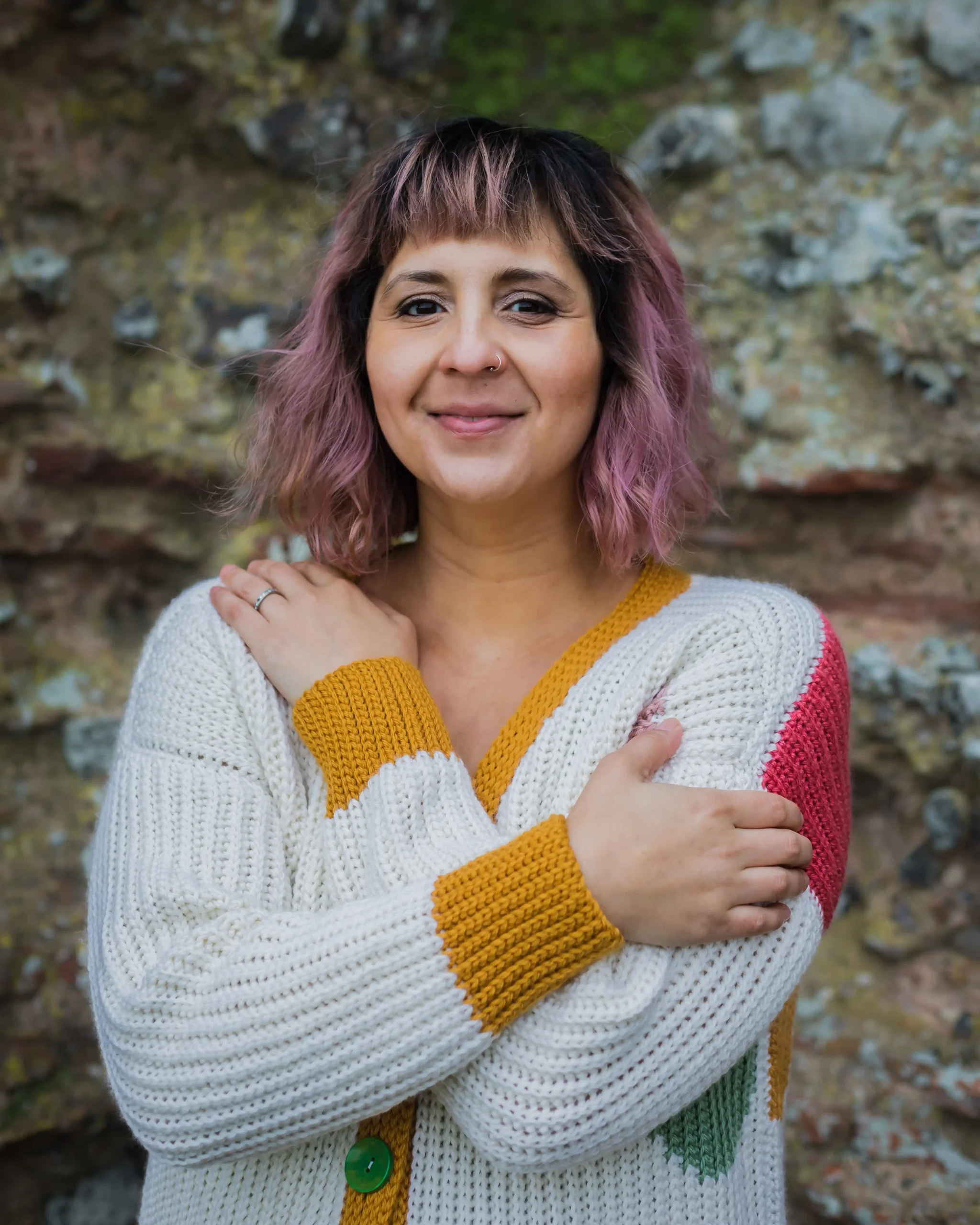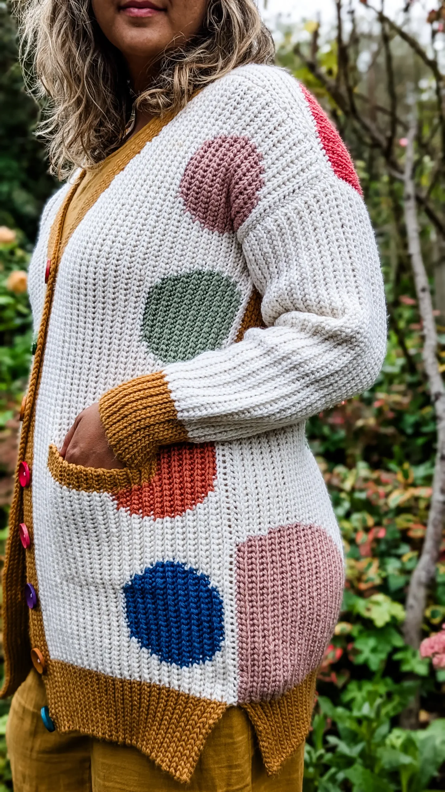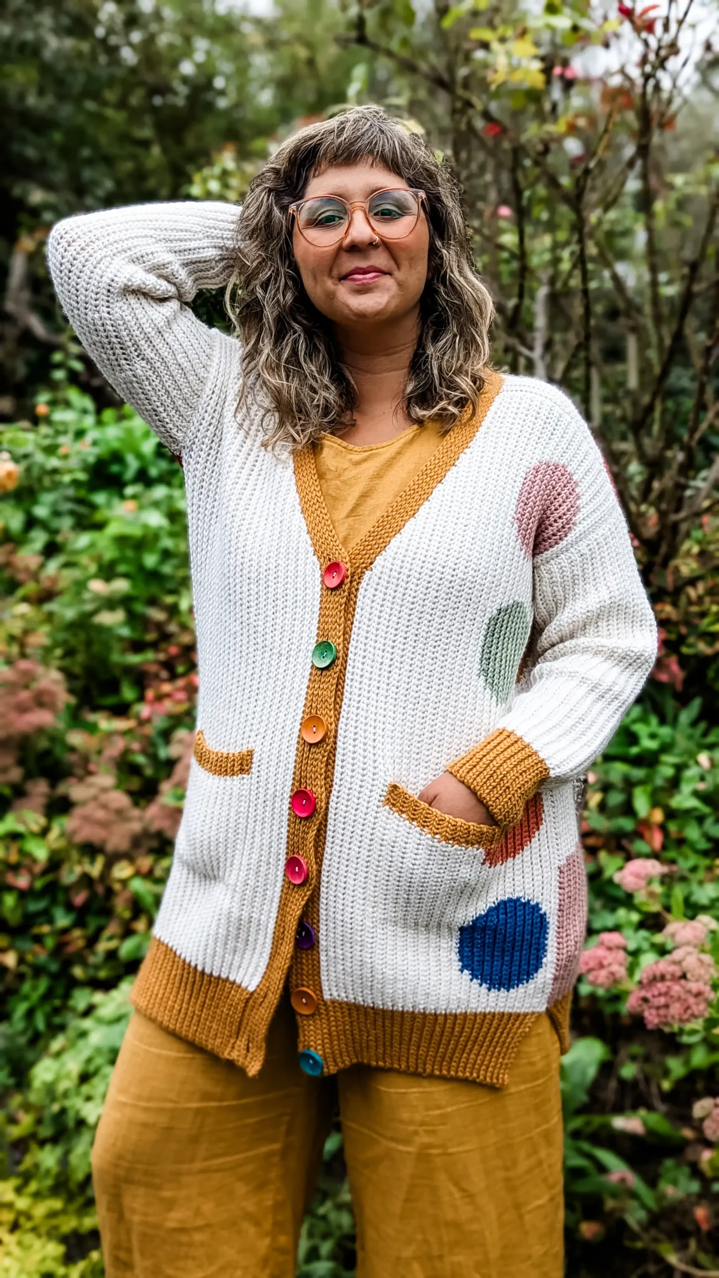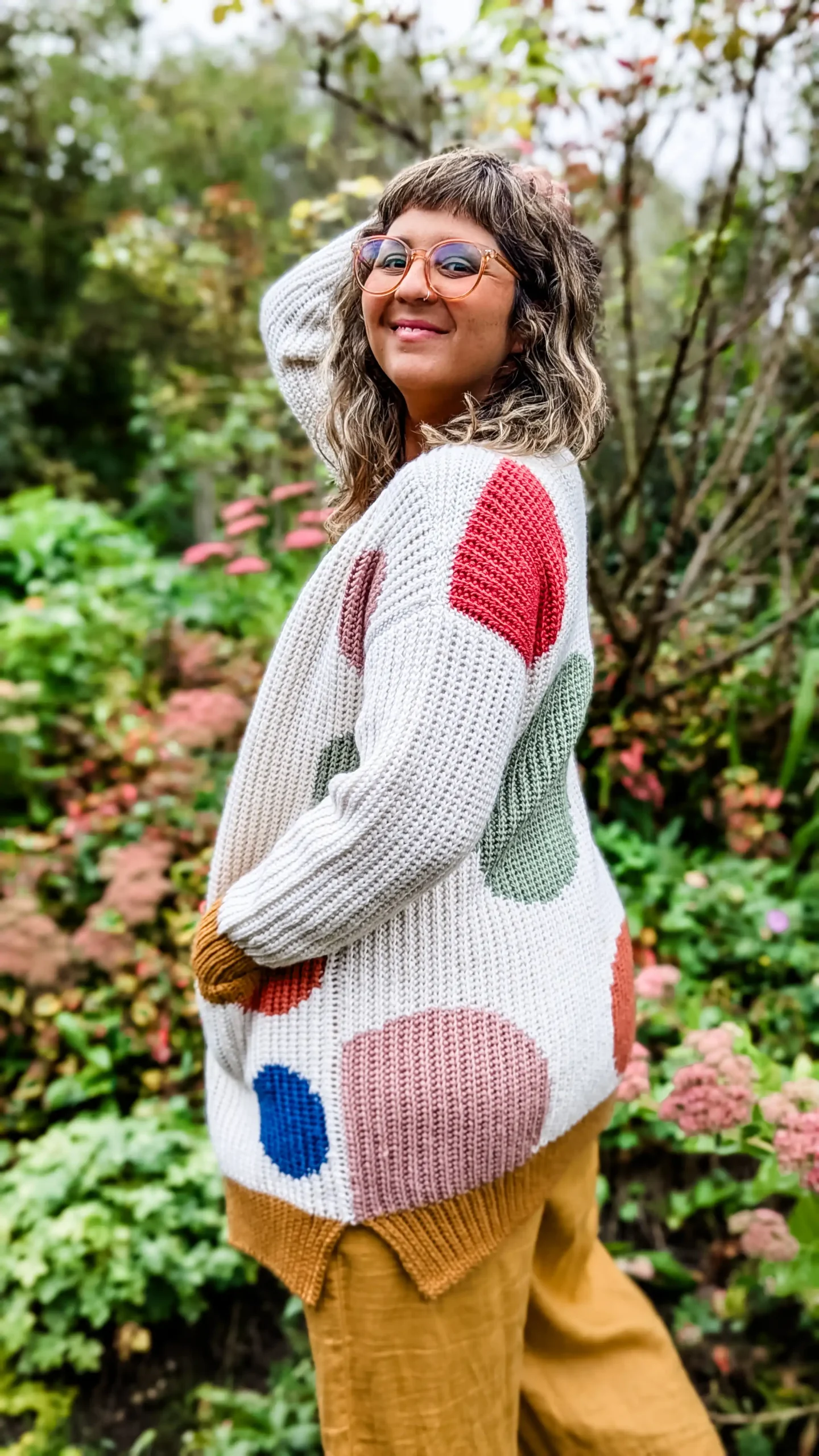 You know that feeling when you see a bunch of puppies playing with ducklings, or a baby’s first smile? That’s Gigil, the overwhelming feeling of cuteness. And Gigil, the cardigan, embraces that feeling of cuteness and innocence to its max. It is a long, oversized cardigan with a fun colorful pattern at the back, two seamless pockets at the front, a split hem and ribbed cuffs, hem, and button band. It is constructed in five separate panels, made in vertical rows, and then sewn together. All color changes are done using intarsia and the pattern includes charts to follow for the color changes.