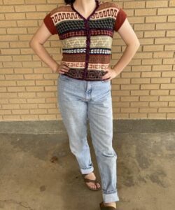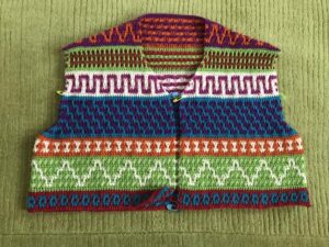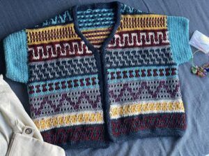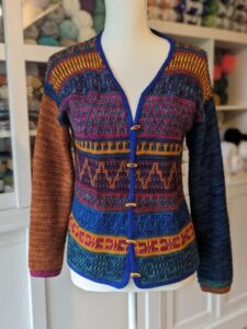 Long Sleeve sample used many different scraps of fingering weight yarn from stash.