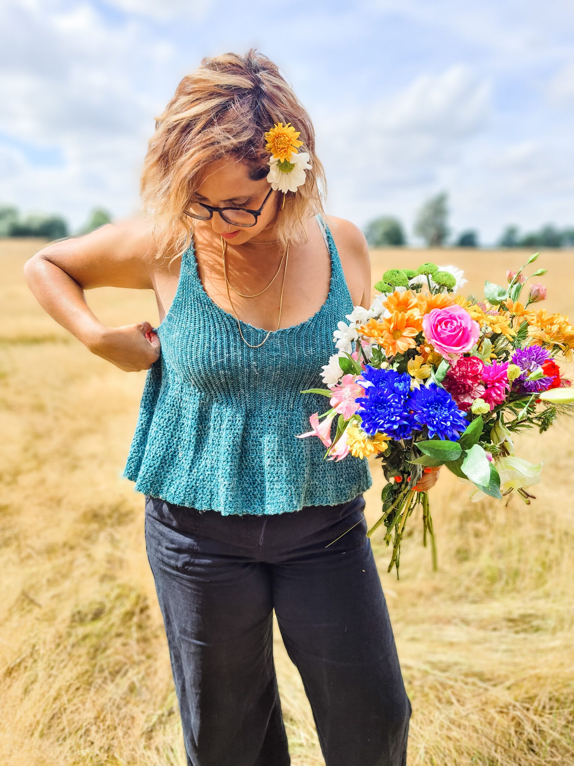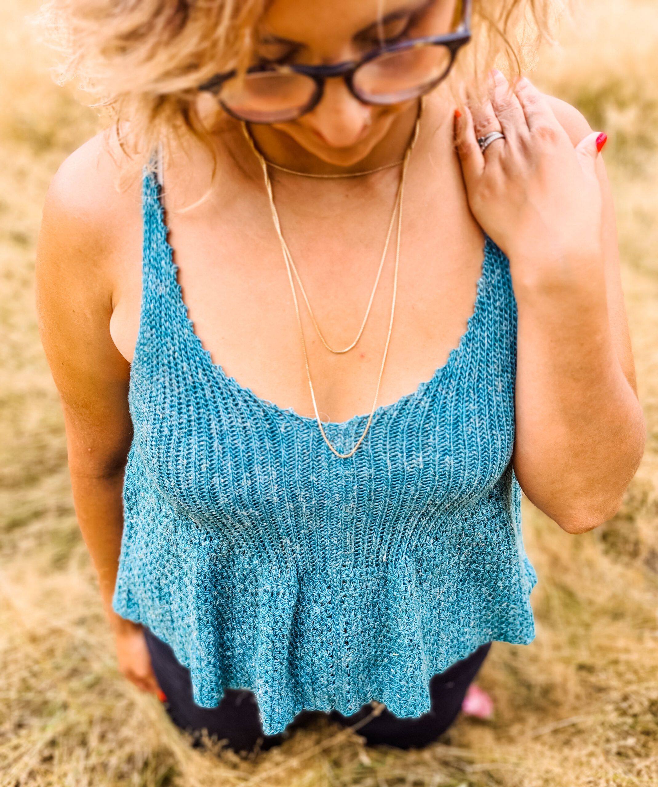 Siwatl [ˈsiwaːtɬ] means “woman” in Nahuatl, the ancient language of the Aztec people who populated a lot of Latin America, including Mexico. As a Mexican artist, my cultural heritage always calls me with inspiration, and as a woman and mother, I see the power in this word. Besides, is there anything more flattering than a peplum cut on a woman? The Siwatl top will elevate the female form while keeping you entertained as you make it. Siwatl sports a fitted bodice with a stretchy ribbing and a lace-like peplum skirt, a deep V-neck at the front and a higher neckline at the back with thin straps. It is worked in vertical rows in two panels that are joined at the center of the front and back.
