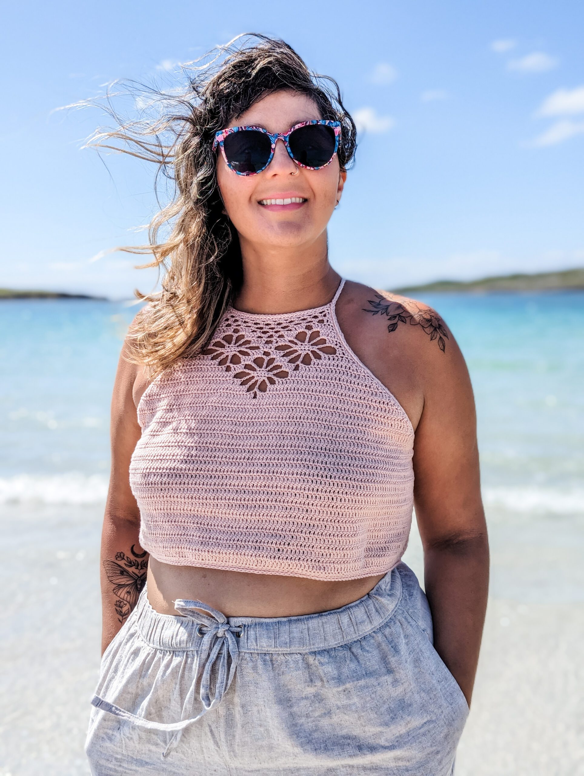 The Triad Top by Sandra Gutierrez is your go-to summer essential for everyday elegance. This more modest version of the Triad Bralette features a beautiful floral lace pattern and a stunning back motif, adding a touch of romance to any outfit.